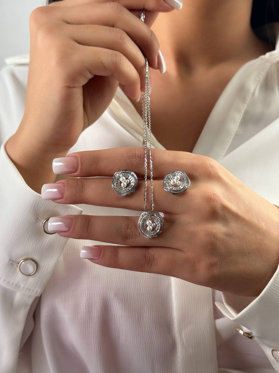 نیم ست جواهری مروارید زنانه نقره کد ۱۴۰۶ wa