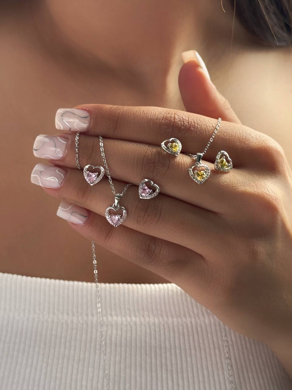نیم ست مینیمال طرح قلب نقره نگین زرد و صورتی کد ۱۴۳۹ ba