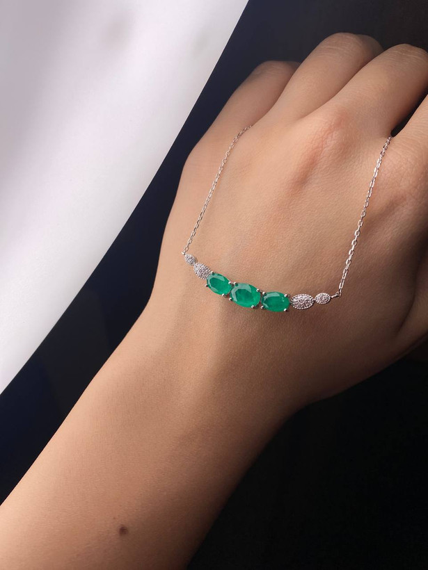 گردنبند زنانه نقره با ۵ سنگ زمرد برزیلی درخشان، طراحی شیکی دارد که میتواند به راحتی به استایل روزمره یا حتی در مراسم خاص اضافه شود. این طراحی مدرن و ظریف برای کسانی که به دنبال زیورآلات با طراحی کلاسیک و در عین حال مدرن هستند، انتخابی عالی است. -
