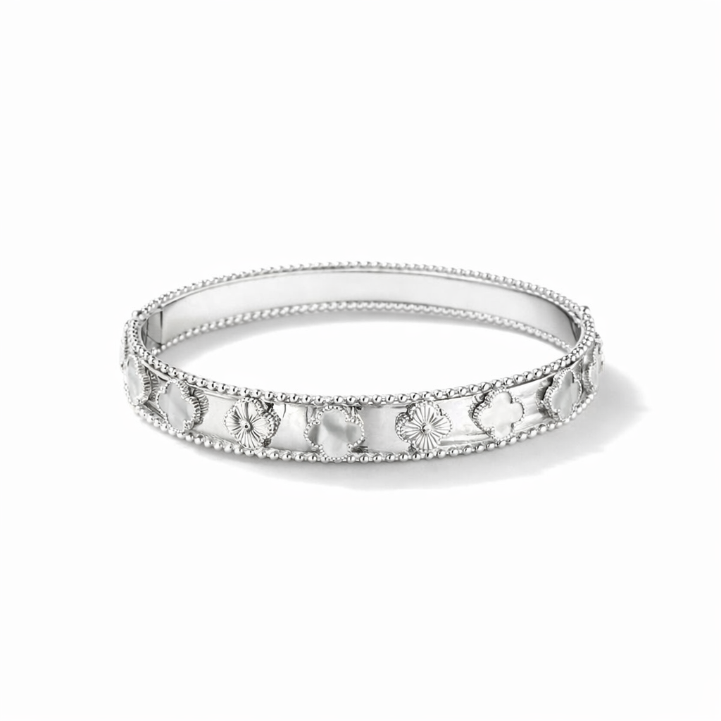 این بنگل ظریف و لوکس با طراحی کلاسیک و موتیفهای گل چهاربرگ، انتخابی ایدهآل برای استایلهای مینیمال و شیک است. ترکیب نقره استرلینگ ۹۲۵ با آبکاری طلا سفید، جلوهای درخشان و ماندگار ایجاد کرده که کاملاً مناسب استفاده روزمره و مهمانیهای رسمی است.