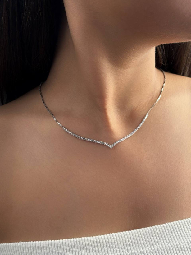 طراحی این گردنبند مبتنی بر الگوی کلاسیک Tennis Necklace است؛ ردیف یکنواخت نگینها با چیدمان دقیق و فرم V ملایم در بخش مرکزی باعث میشود خط گردن کشیدهتر و ظریفتر دیده شود. این فرم برای یقههای باز، دکلته و لباسهای رسمی بسیار ایدهآل است. ظاهر آن شباهت بالایی به نمونههای طلای سفید دارد و در نگاه اول تمایز آن دشوار است.