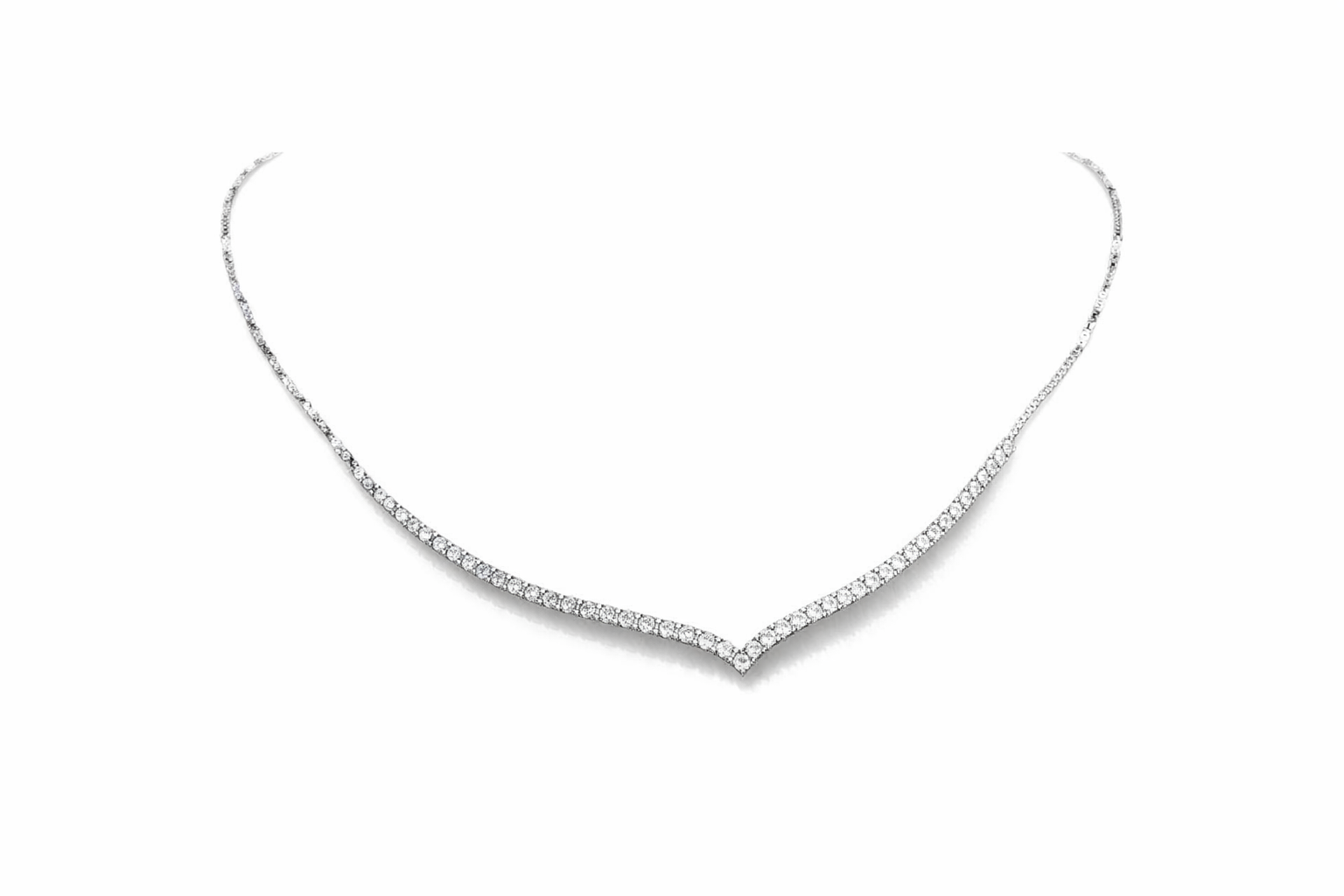 طراحی این گردنبند مبتنی بر الگوی کلاسیک Tennis Necklace است؛ ردیف یکنواخت نگینها با چیدمان دقیق و فرم V ملایم در بخش مرکزی باعث میشود خط گردن کشیدهتر و ظریفتر دیده شود. این فرم برای یقههای باز، دکلته و لباسهای رسمی بسیار ایدهآل است. ظاهر آن شباهت بالایی به نمونههای طلای سفید دارد و در نگاه اول تمایز آن دشوار است.