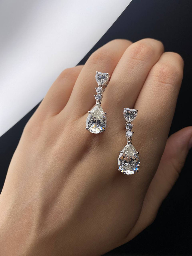 • طراحی منحصر به فرد: این گوشوارهها با ترکیب الماسهای با برش قلب و قطرهای طراحی شدهاند که جلوهای بینظیر و براق به آنها میبخشد.