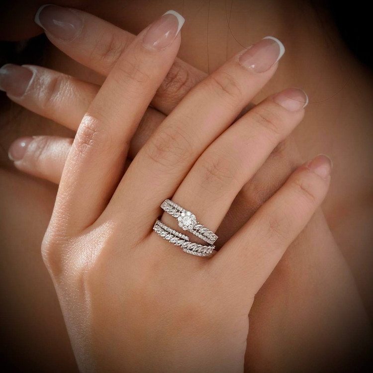 • طراحی لوکس و مدرن: این مجموعه شامل دو حلقه با طراحی منحصر به فرد و زیبا است. حلقه بالایی با یک نگین مرکزی بزرگ و حلقه پایینی با ردیفهایی از نگینهای کوچکتر تزیین شدهاند.